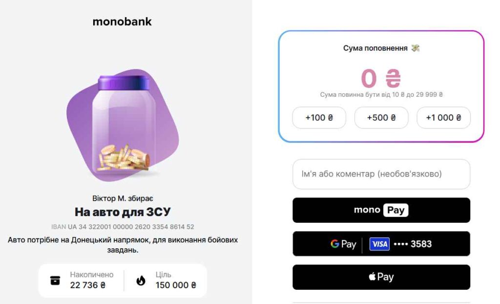 - за посиланням на банку https://send.monobank.ua/jar/98gZmLcHiX