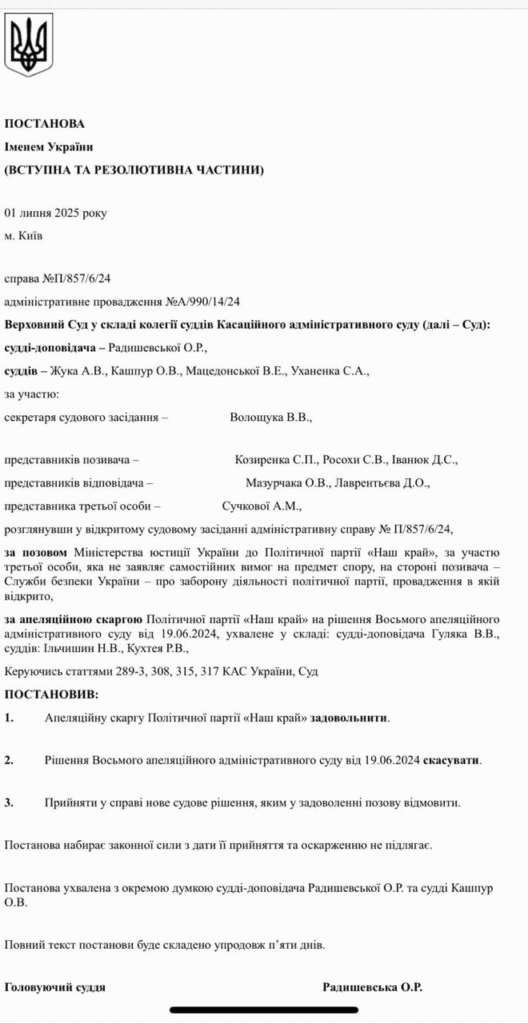 “Керуючись статтями 289-3, 308, 315, 317 КАС України, Суд постановив: апеляційну скаргу Політичної партії “Наш край” задовольнити; рішення Восьмого апеляційного адміністративного суду від 19.06.2024 скасувати; прийняти у справі нове судове рішення, яким у задоволенні позову відмовити. Постанова набирає законної сили з дати її прийняття та оскарженню не підлягає”, – йдеться в тексті документу, датованого 1 липня.
